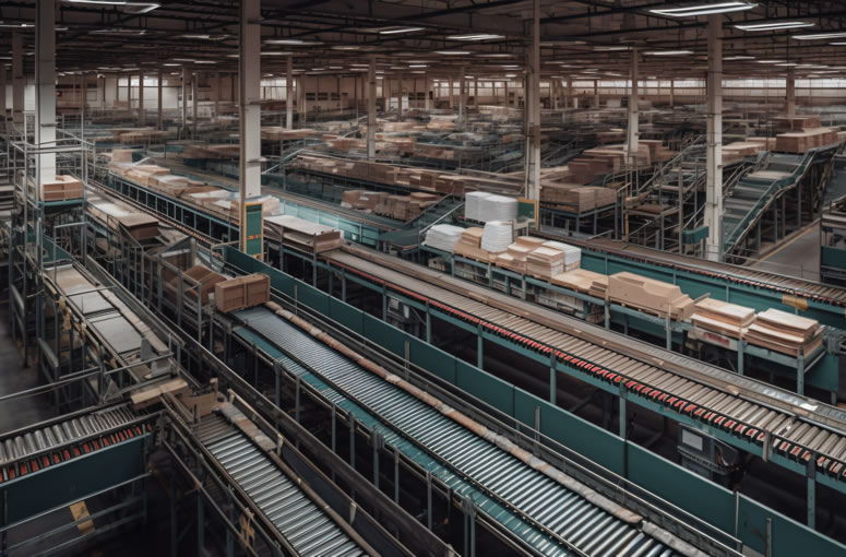 在环绕库房、生产车间和包装车间的场地,设置有由许多皮带输送机、滚筒输送机等组成的一条条输送链,经首尾连接形成连续的输送线。